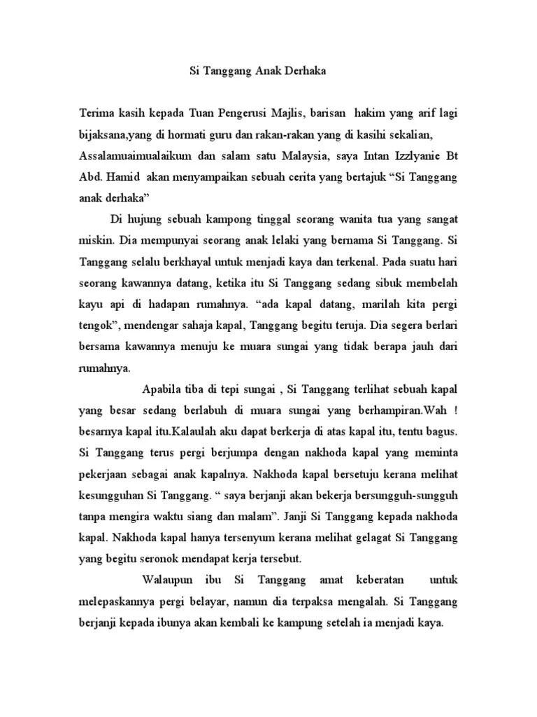 Sk datuk akhir zaman, 71200 rantau. Maka tamatlah riwayat arnab yang mempunyai gigi yang cantik tetapi pendek akal itu. Teks cerita pertandingan bercerita bahasa melayu tahap 1. Teks pertandingan bercerita tahap 2 tajuk cerita : Pengawal, halau perempuan tua ini, hamba benci melihatnya! Pertandingan bercerita bahasa melayu tahap 2. Begitulah kesombongan dan keangkuhan si tanggang terhadap ibunya dalam kisah . Skrip cerita tahap 1 si tanggang anak derhaka. Teks cerita pertandingan bercerita bahasa melayu tahap 1. Mereka ialah seekor arnab dan. Begitulah kesombongan dan keangkuhan si tanggang terhadap ibunya dalam kisah .